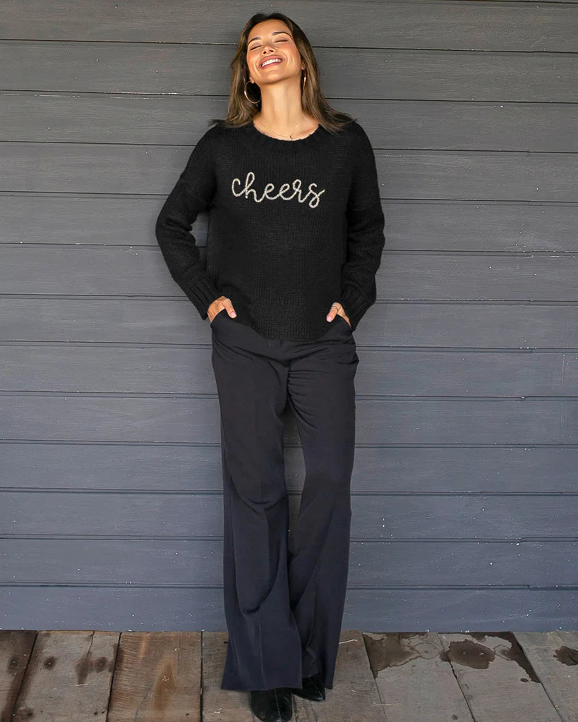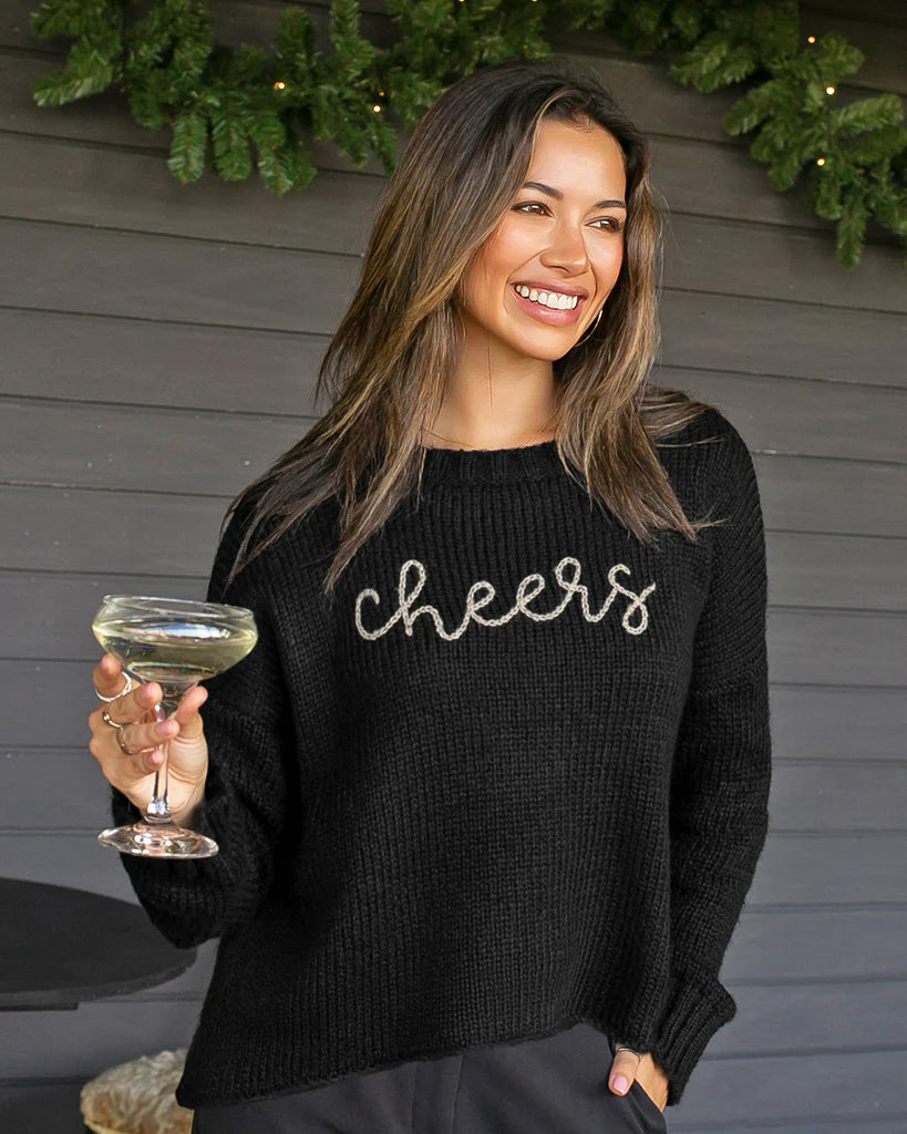 Buttery soft and lightweight, this sweater is exceptionally comfortable and effortless to wear. It features the word 'cheers' embroidered on the center front. The dropped shoulders create extra slouch, while the length keeps the fit flattering. The modern oversized, boxy fit enhances its festive appeal.