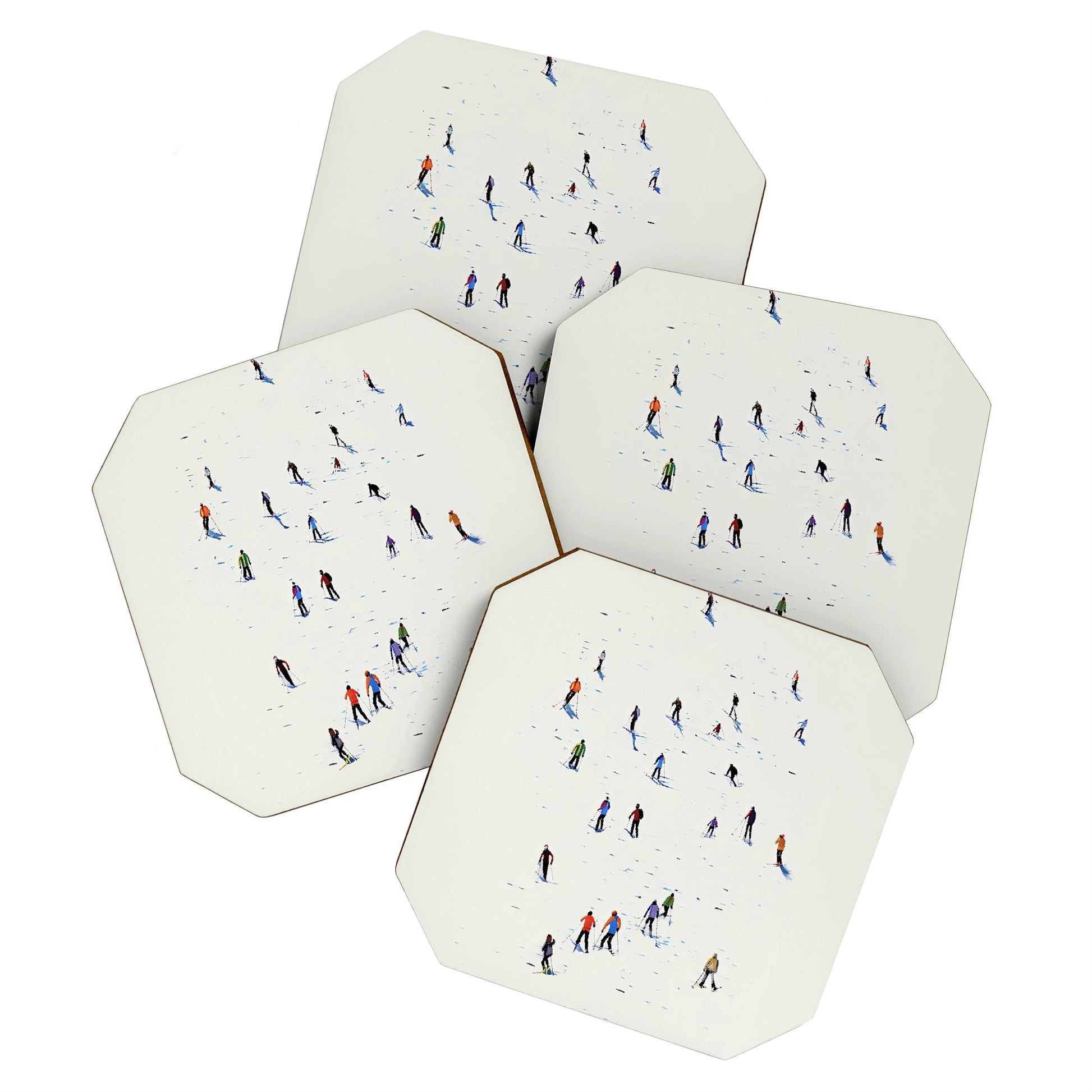 - Set of four high-density satin finish fiberboard coasters with the same design printed on each