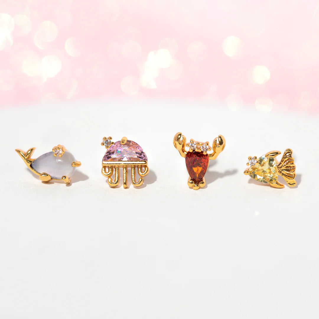 - Includes 4 mismatched earrings: whale, jellyfish, lobster, and fish
