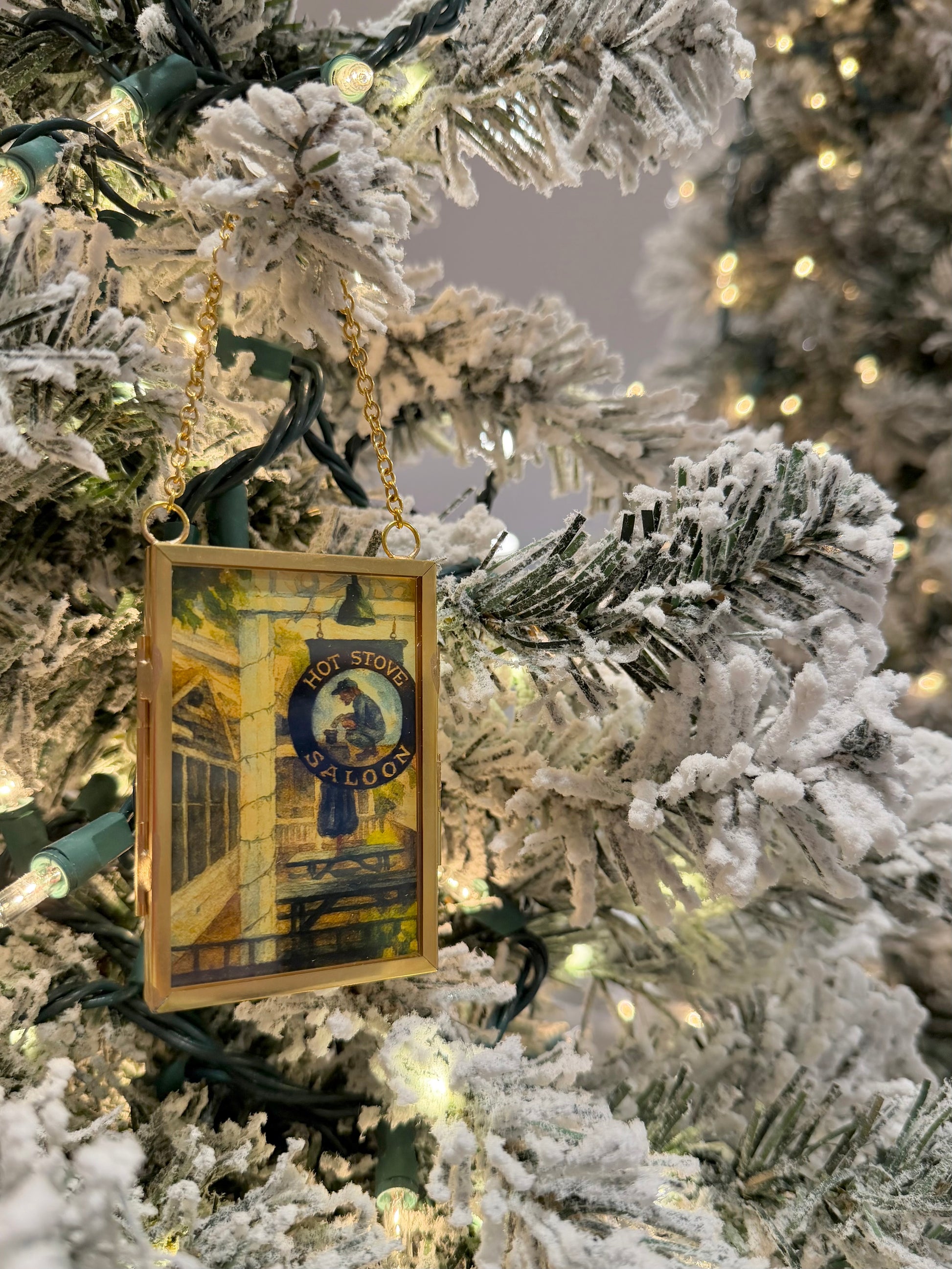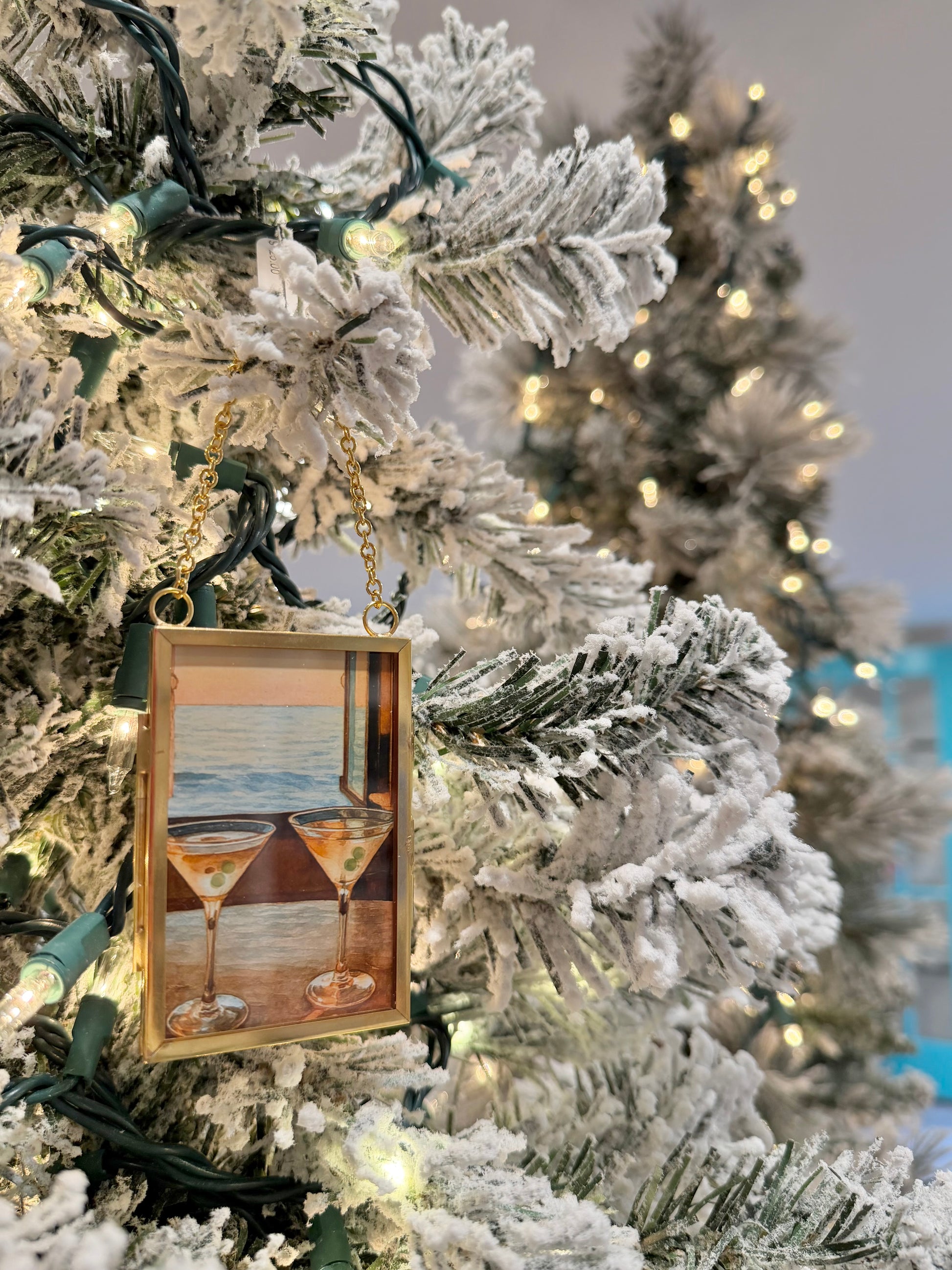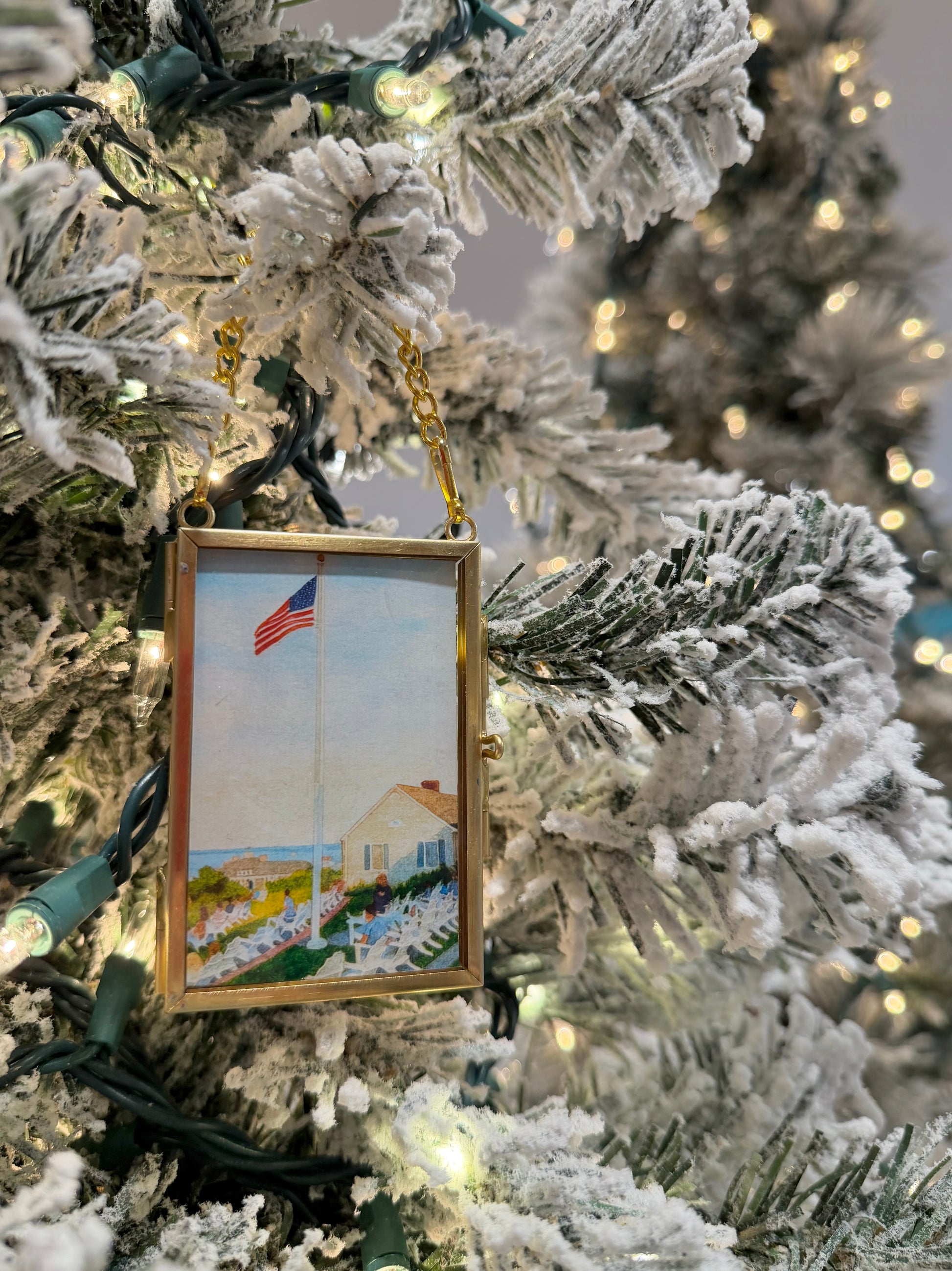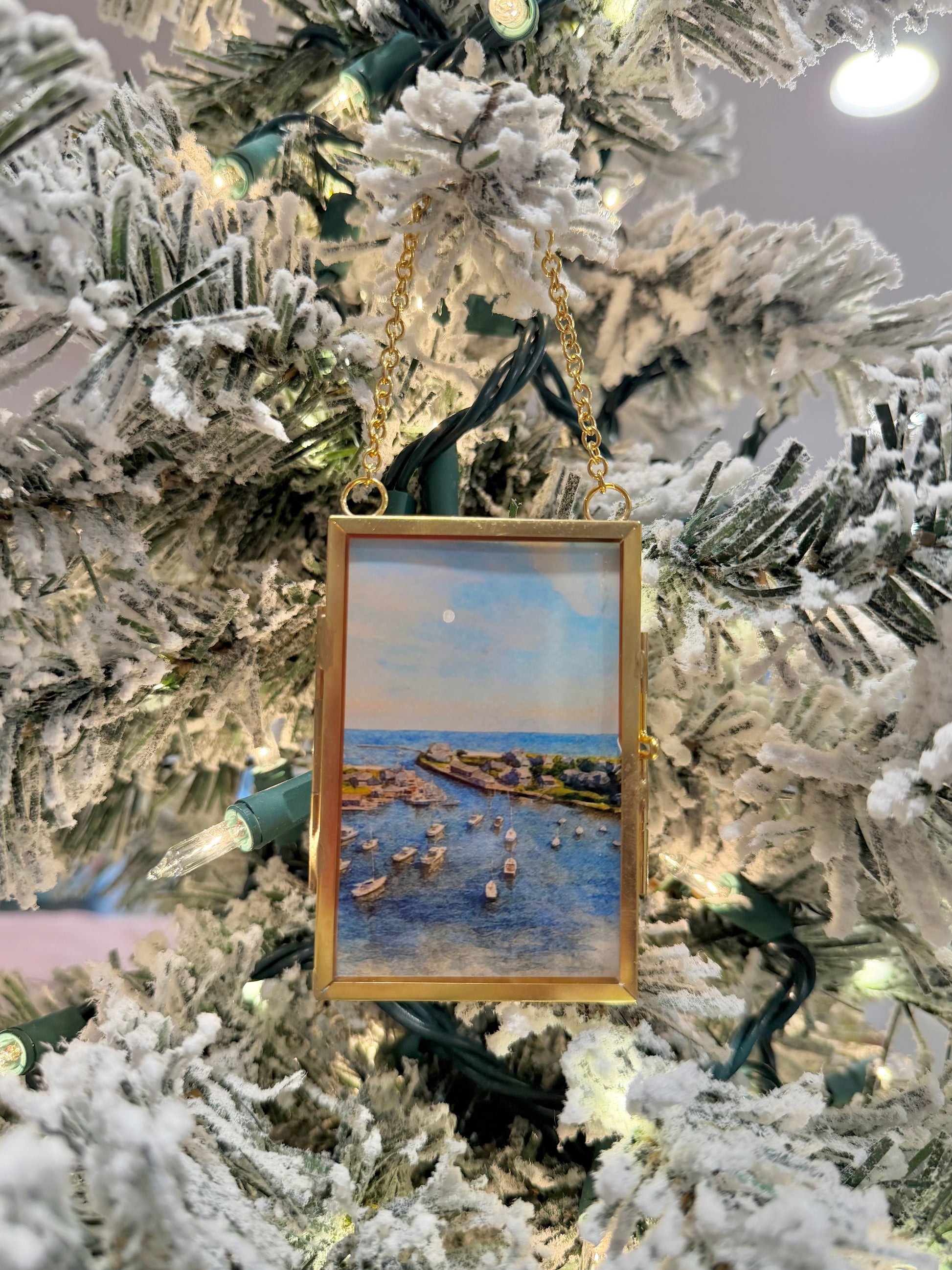 This charming Cape Cod creation is your tiny golden treasure - perfect for dangling from your tree as a festive ornament or nestled on a shelf as quirky wall art. With its gleaming gold chain and crystal clear glass frame, it's the mini statement piece your space has been waiting for.