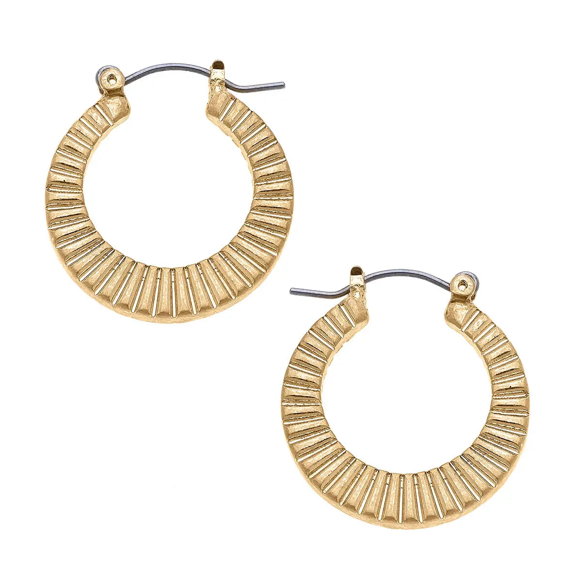 Our Kara Ribbed Metal Sunburst Hoop Earrings feature a unique, textured look that can be worn casually or dressed up! Both lightweight & comfortable, these sunburst gold hoops add a subtle touch of glamour to your everyday.