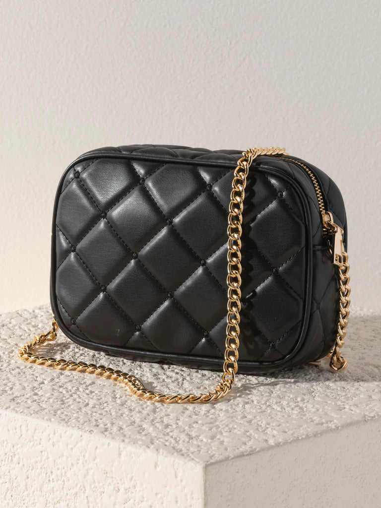 - Made from quilted PU with gold hardware