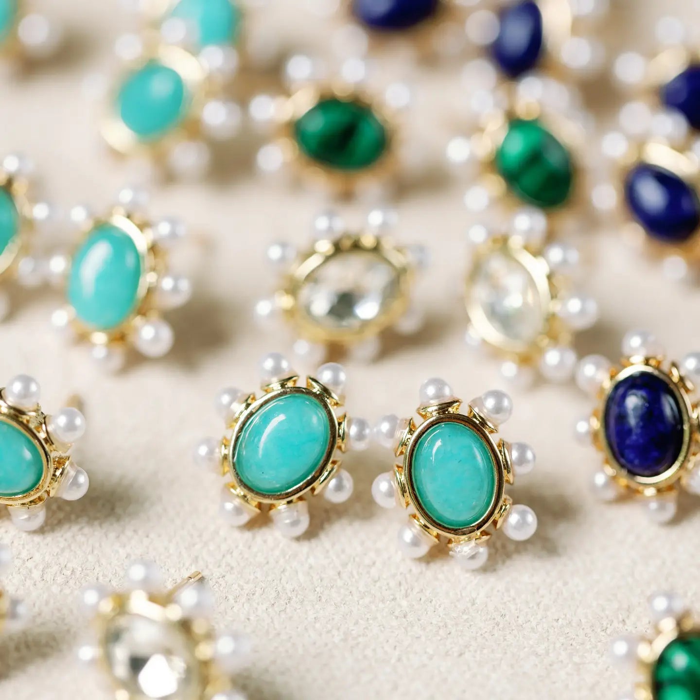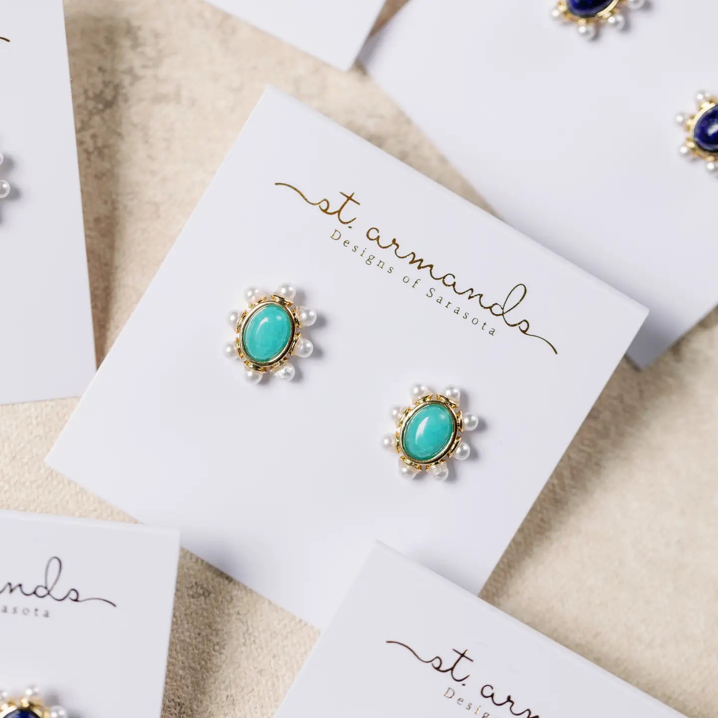 Vintage gold tones are among this year's biggest trends, and we are delighted to introduce our newest stud earrings featuring a stunning turquoise stone at the center, outlined by delicate pearls. This mini style, perfect for everyday wear, is 1/2 inch in size and perfect for all seasons.