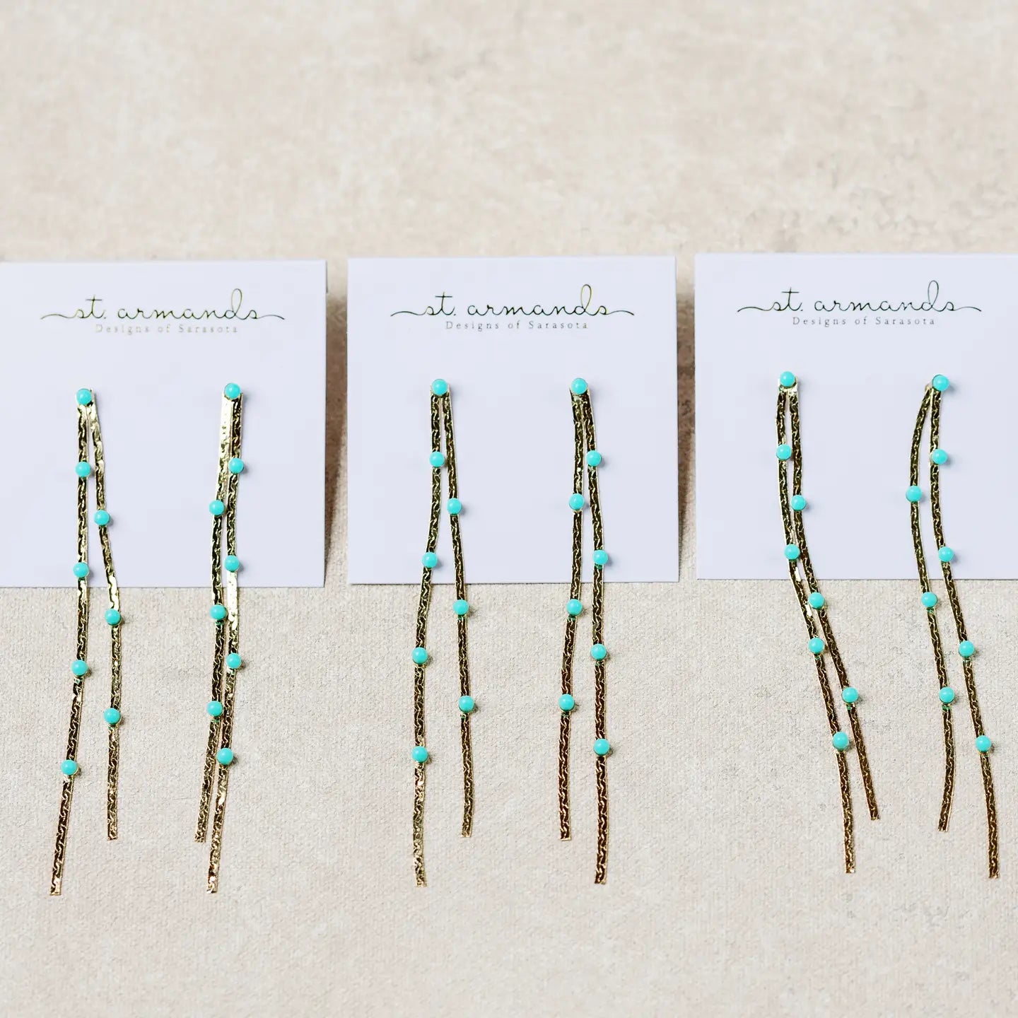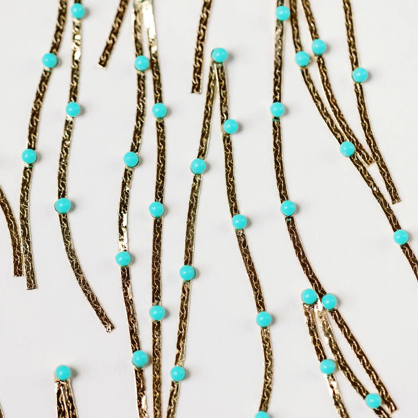 These stunning minimalist skinny gold tassel earrings feature delicate gold chains adorned with bright turquoise beads that gracefully cascade and catch the light. Perfect for summer, the turquoise beads beautifully complement the gold, making these earrings an ideal accessory. 3.5" Drop Ultra Lightweight
