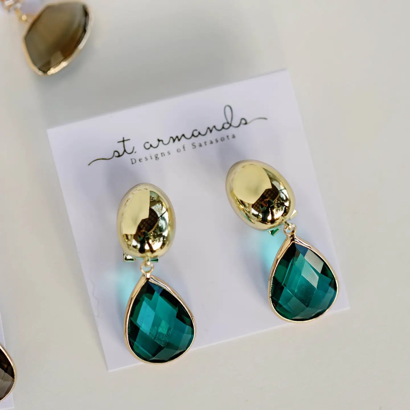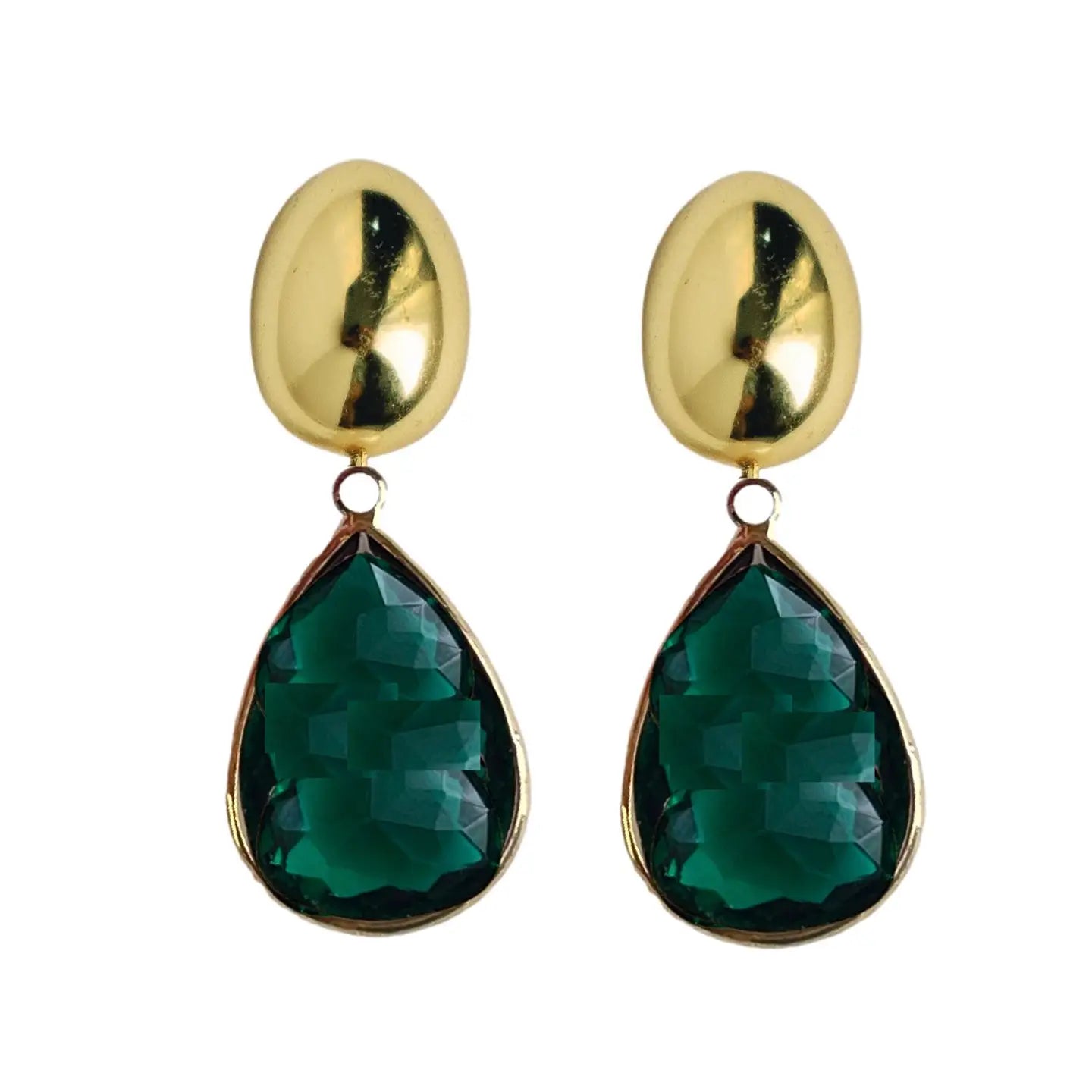 Introducing our exquisite vintage-inspired chunky gold and green drop earrings! A timeless statement piece featuring a synthetic green gemstone delicately suspended from a luxe gold chunky top! These classic earrings are lightweight and perfectly sized at 2.5 inches!